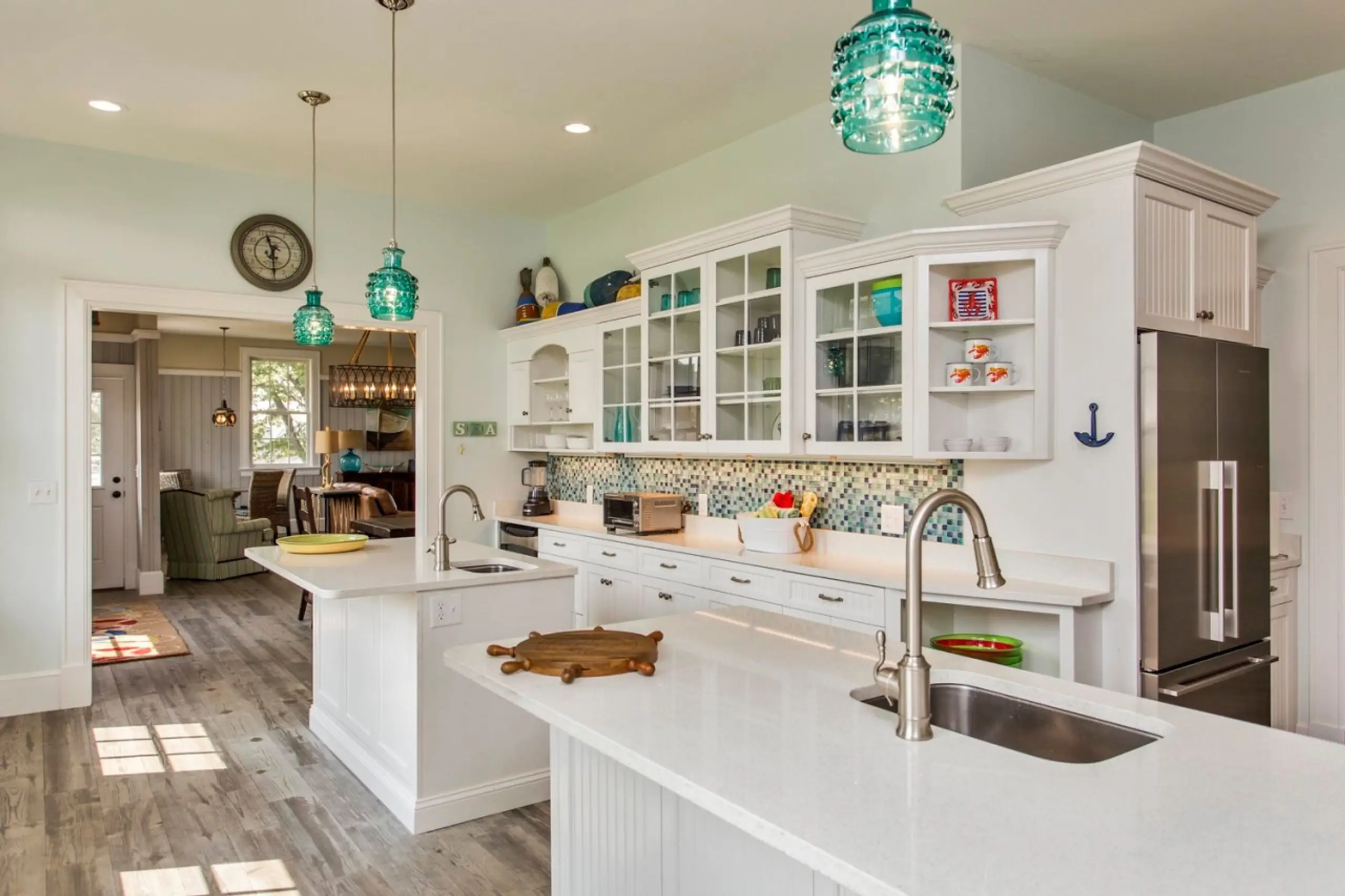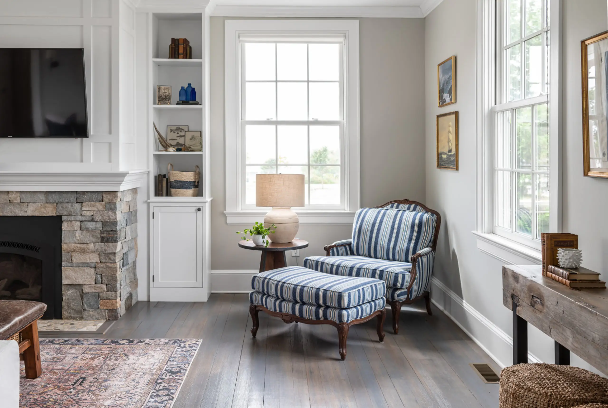 Step inside and everything just...exhales. Think curated restraint: light-washed floors, layered textures, stone fireplaces, and just enough vintage charm to ground the clean lines. The living room is anchored by soft neutral tones, plush seating, and a gas fireplace wrapped in natural stone—equal parts cozy and coastal cool. Nautical nods, custom art, and curated shelf moments bring personality without ever trying too hard.