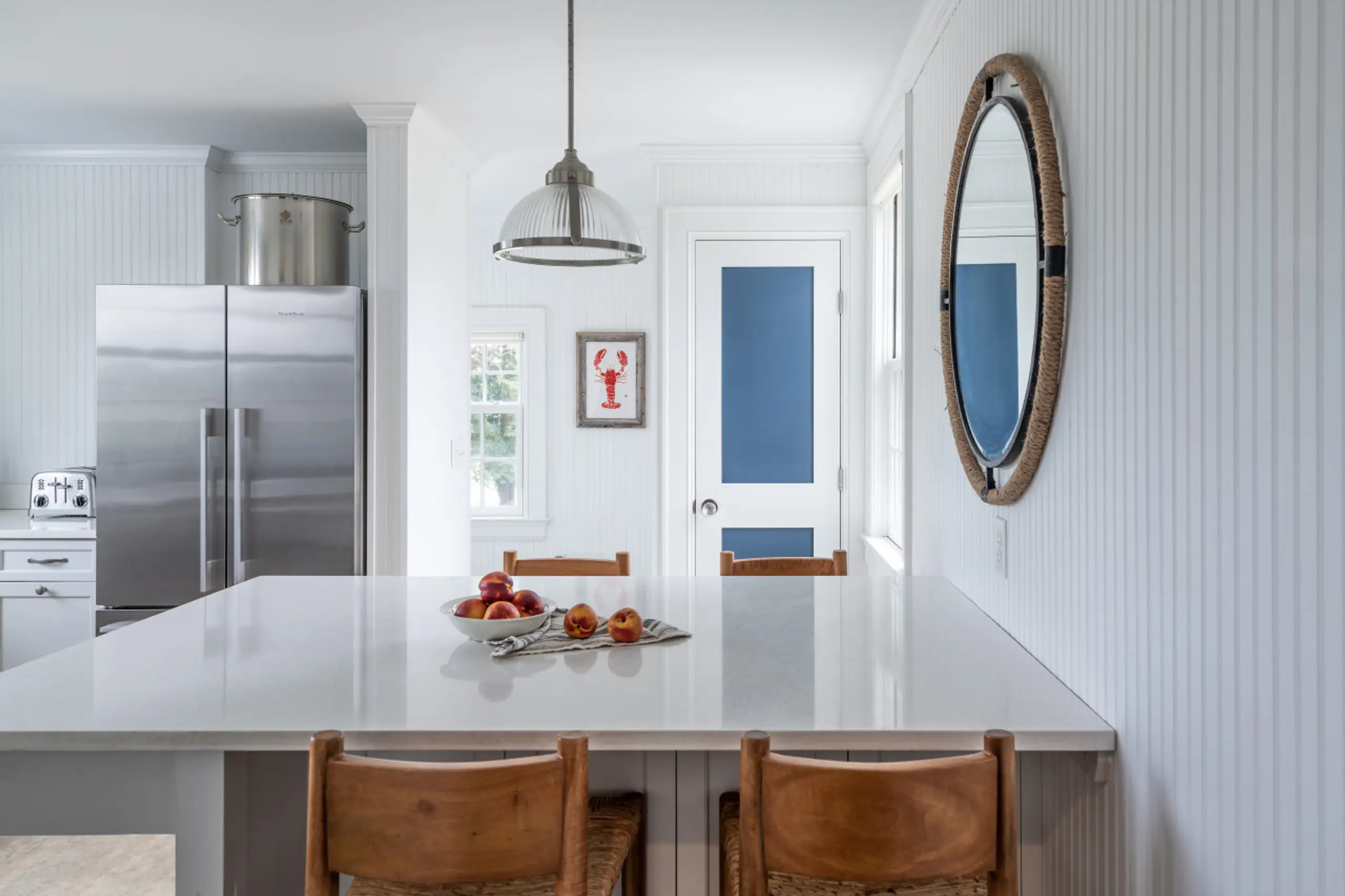 The kitchen is bright, open, and built for feeding a crowd. Double islands, a deep farmhouse sink, and plenty of prep space make it easy to go full lobster-bake or laid-back bagel brunch. A separate dining room with seating for 10+ gives big family dinners the space they deserve.
