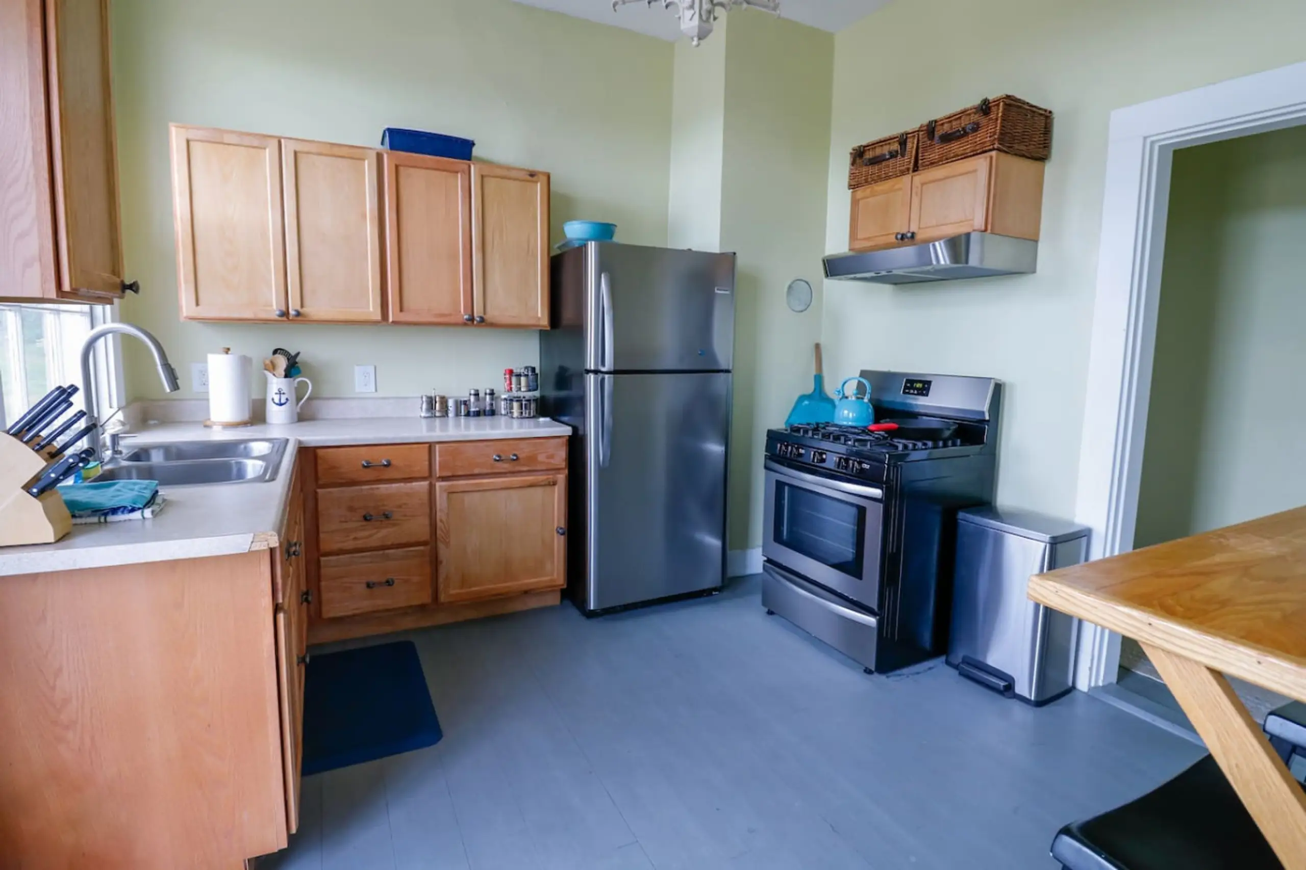 A fully renovated interior with breezy coastal design and central A/C throughout. The kitchen is smartly stocked with labeled drawers, a spice rack, and a lobster pot—because if you’re not boiling lobsters, are you even in Maine?